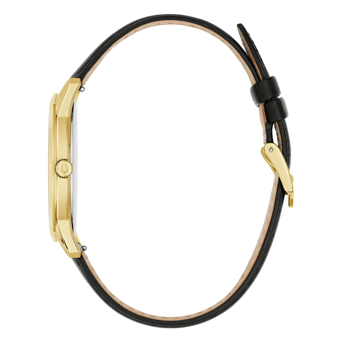 Orologio da Uomo della Marca Bulova della collezione Classic. Il segnatempo ha una cassa rotonda in acciaio dorato lucido e satinato con diametro di 40 mm. La ghiera è fissa in acciaio dorato lucido. Il quadrante è di colore argentè con lavorazione soleil ha indici con numeri arabi in acciaio lucido. Il movimento è un Quarzo semplice ad ore 3 è presente la data del mese. La corona logata è a trascinamento in acciaio. Il vetro è minerale piano. Il cinturino è in pelle nera liscia con cuciture laterali. La chiusura è fibbia logata bulova. La resistenza all'acqua è di 3 atm.