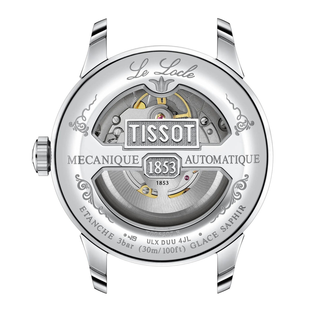 Orologio da Uomo della marca Tissot, modello Le Locle. Il segna tempo ha un meccanismo Automatico Powermatic 80 con riserva di carica di 80 ore quando si toglie l'orologio dal polso, la cassa misura 40 mm in acciaio lucido e satinato, il quadrante è di colore blu effetto lucido con lancette in acciaio ed indici icon numeri romani, il cinturino è in pelle blu con lavorazione tartarugata, la ghiera è in acciaio lucido, il vetro è zaffiro antigraffio, la corona logata è a trascinamento, il fondello è serrato a vite ed è inciso con la personalizzazione del carattere e stile Le Locle, la resistenza all'acqua è di 3 atm.