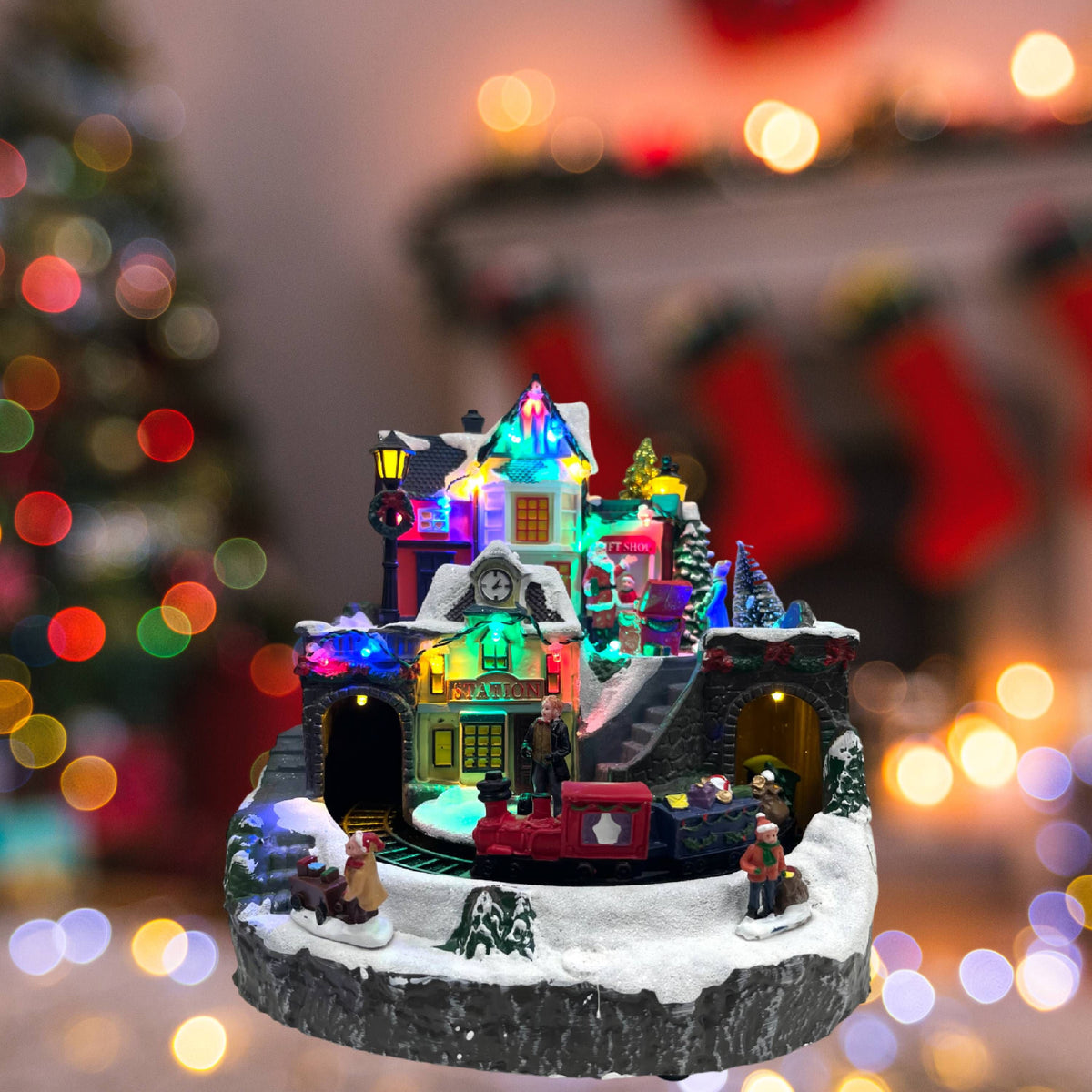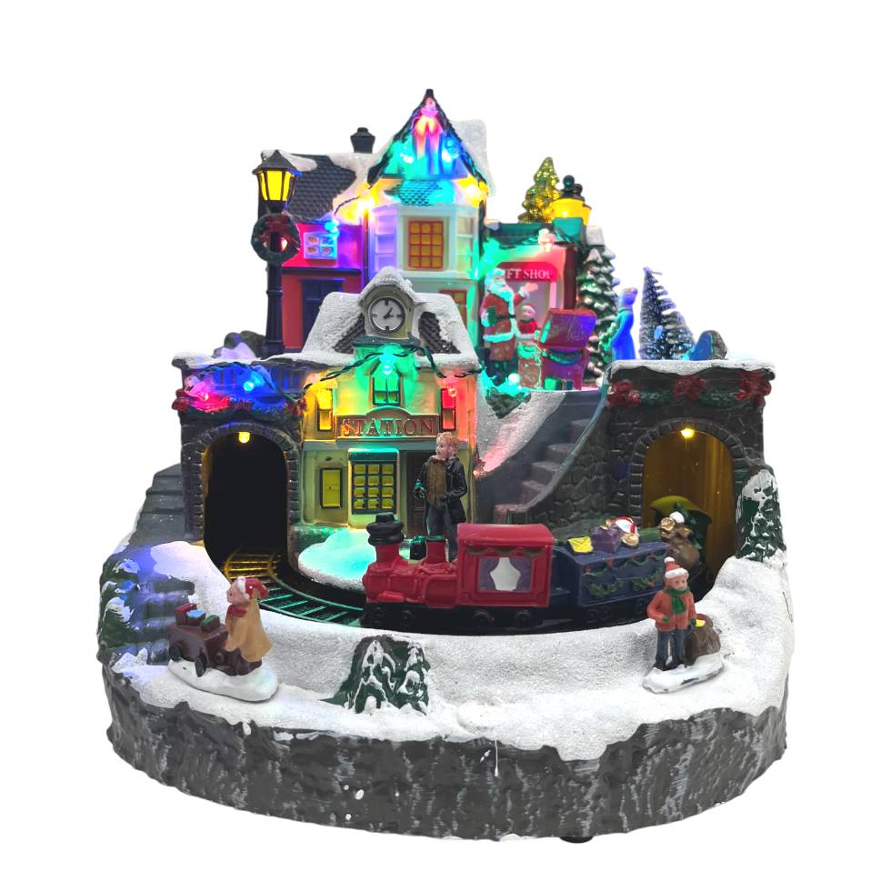 Questa bellissima scultura di Natale, rappresenta un paesaggio tipico Natalizio con un trenino che si muove e luci alimentati con batterie. La scultura saprà impreziosire la vostra casa nelle festività natalizie. I dettagli sono fantastici.