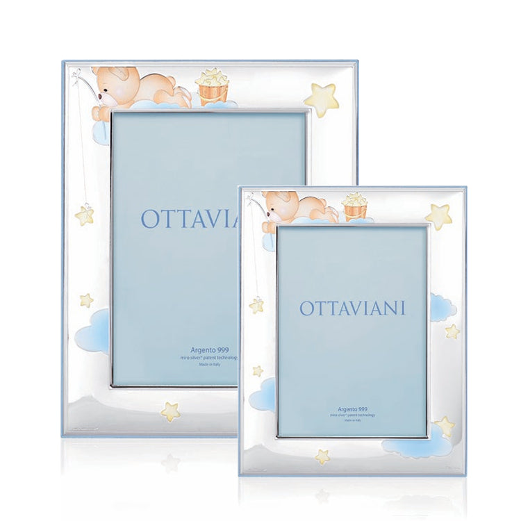 Portafoto Ottaviani In Argento 999, moderno ed elegante con un design che esprime gioia per la nascita di un bimbo, perfetta per arredare ogni cameretta o ambiente dove si voglia portare una nuova gioia. Il disegno sulla cornice rappresenta l'orsetto pescatore di stelle pogiato su una nuvola. Le dimensioni interne sono 9x13 cm.