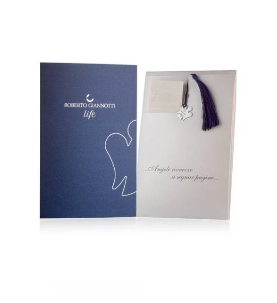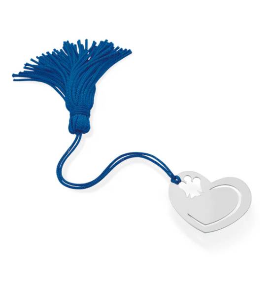 Segnalibro della marca Roberto Giannotti. Il segnalibro è realizzato in Argento 925 caratterizzato da un pendente con cuore e angelo traforato, con nappina blu. Misura: cuore, base: 2,7 cm e altezza 2,3 cm